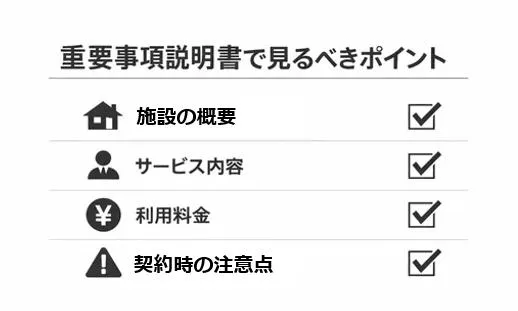 実際に重要事項説明書をチェックする際、「重要事項説明書とは何か」を事前にきちんと理解しておくと、施設職員からの説明がよりしっかりと頭に入り、内容の確認もスムーズに行えるでしょう。