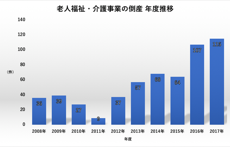 株式会社東京商工リサーチの発表によると、2017年度の介護事業者の倒産件数は115件に上り、介護保険法が施行された2000年以降、過去最多の数字となりました。倒産した事業者を業態別に見てみると、「通所介護(デイサービス)」または「訪問介護」が91件を占めており、「有料老人ホーム」は9件、サービス付き高齢者向け住宅などを含む「その他の老人福祉・介護事業」は8件ほどに留まりました。