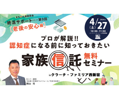 | 備考 | 会場参加の方は、4月1日(月)にオープンした介護付き有料老人ホーム『クラーチ・ファミリア西新宿』の内覧も可能です! 別日に見学希望の方も申込みフォームまたは電話、メールにてお申し込みください。 |