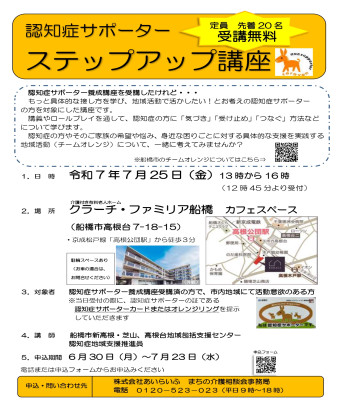 | タイトル | 7/25(金)認知症サポーター ステップアップ講座 in 船橋 |