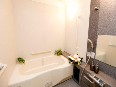 明るく広い浴室で心地よく疲れを落とせます。また、介護度の高い方にも安心の設備とサポートを提供いたします。