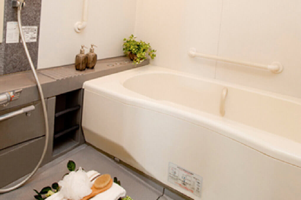 広さ、清潔感とも申し分なしの浴室。手入れも行き届いており、車いすの方でもご安心してお使いいただけます。