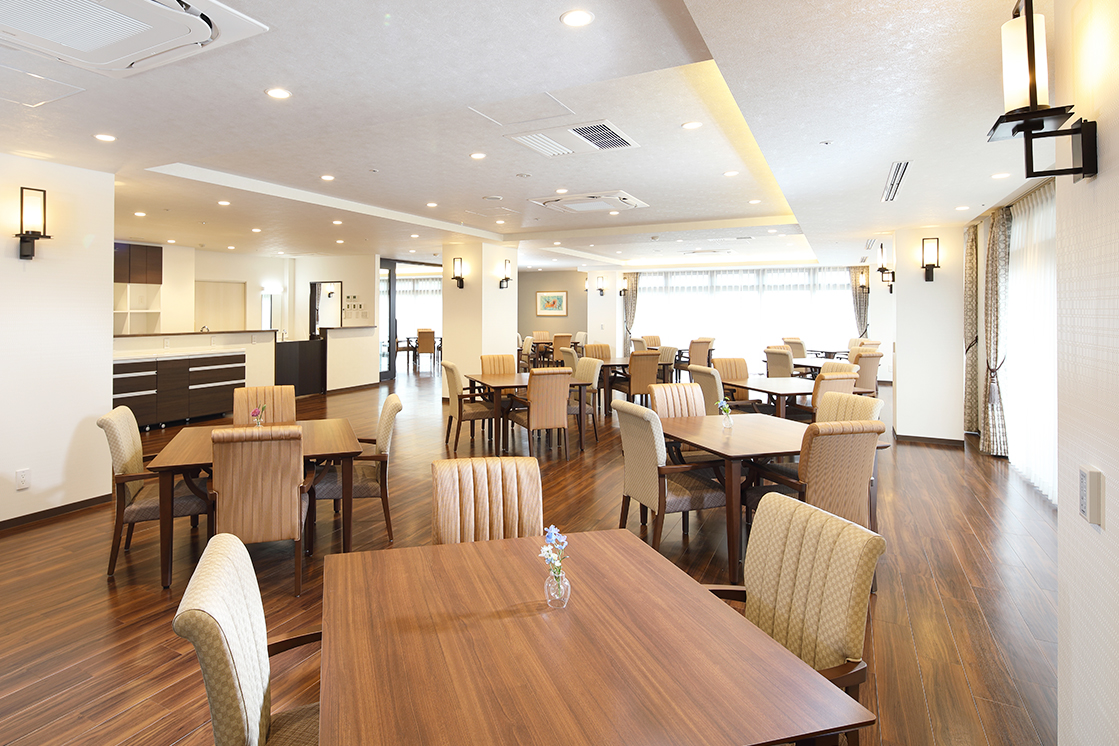 ダイニングルーム、ティールーム、ビューティサロン(各種の外部サービス〔利用者実費負担〕を受けるための部屋)、ファミリールーム、機能訓練室、健康管理室兼事務室、洗濯コーナー、浴室