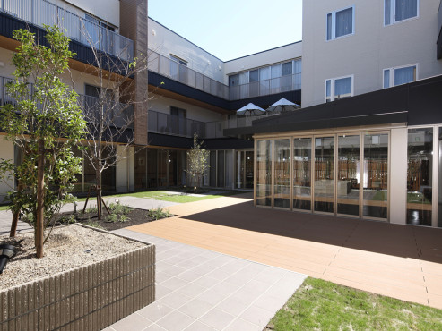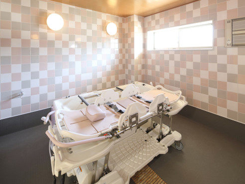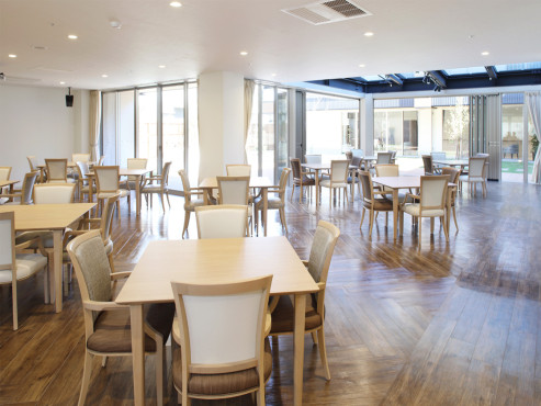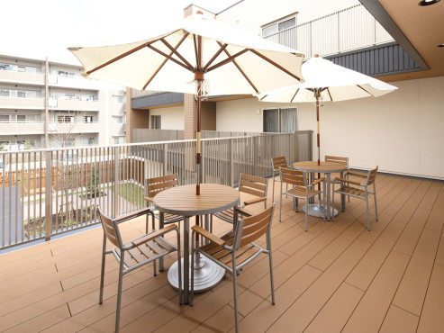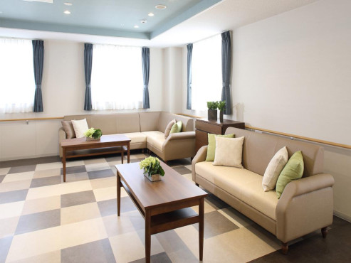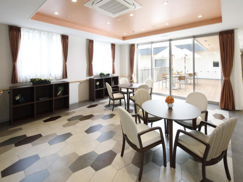 ウッドデッキ、ダイニングルーム兼機能訓練室、ビューティサロン(各種の外部サービス〔利用者実費負担〕を受けるための部屋)、ファミリールーム、健康管理室兼事務室、洗濯コーナー、多目的ルーム、談話スペース、浴室