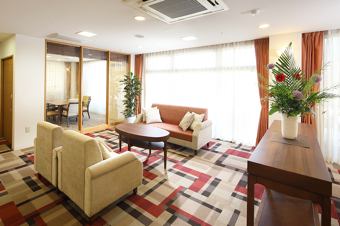 ダイニングルーム兼機能訓練室、ティールーム、ビューティサロン(各種の外部サービス〔利用者実費負担〕を受けるための部屋)、ファミリールーム、健康管理室兼事務室、浴室