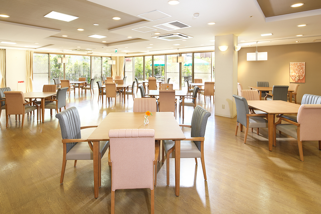 広々としたスペースで、ご入居者様にお食事を楽しんでいただいています。行事やアクティビティなどにもご利用いただいています。