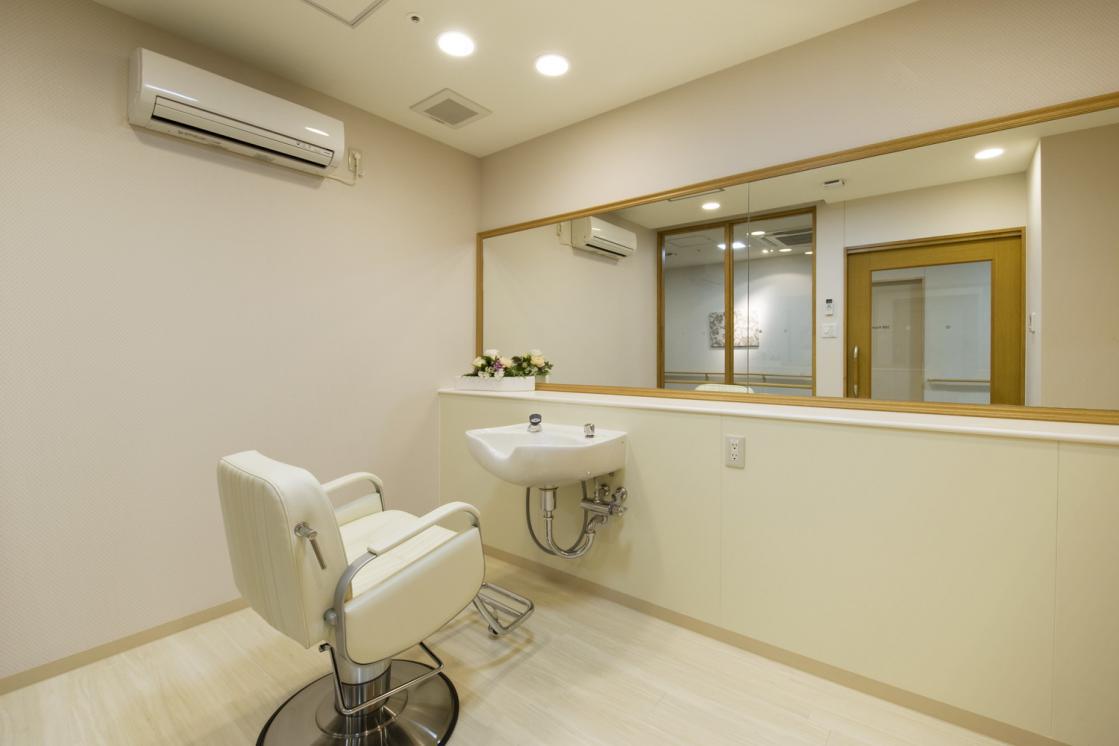 週に一回程度実施している、有料訪問理美容でご利用いただいています。カット、シャンプー、パーマ、ヘアマニキュアなどのメニューをご用意しています。(各種の外部サービス〔利用者実費負担〕を受けるための部屋)
