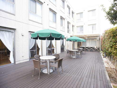 当ホームには、フロアごとに雰囲気の違うティールームやカフェラウンジなど自由にくつろいでいただける空間が多数あります。1階の広々としたウッドデッキにも、ソファーとテーブルを設置してカフェスペースとしてご利用いただいています。ほかのご入居様やご家族様と談笑したり、新聞や本を読みながらゆっくりコーヒーを楽しまれたり、思い思いに過ごしていただけます。また、サービススタッフと一緒にテラスのお花の手入れをして、自然と触れ合うスペースにもなっています。