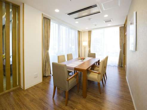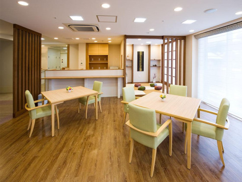 ダイニングルーム兼機能訓練室、ティールーム、ビューティサロン(各種の外部サービス〔利用者実費負担〕を受けるための部屋)、ファミリールーム、健康管理室兼事務室、浴室