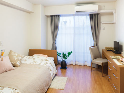居室には介護用ベッド、寝具、エアコン、クローゼットが備え付けとなっております。