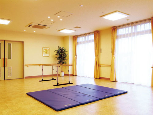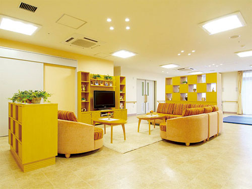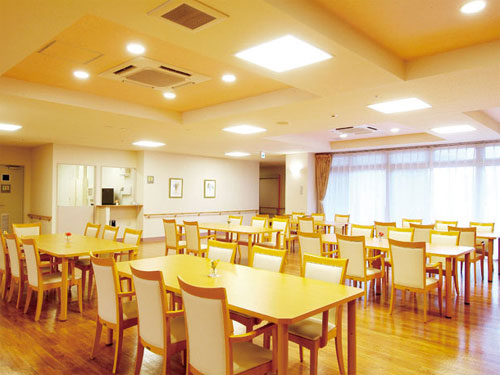 エントランスロビー、ダイニング(食堂)、相談室、多目的室 兼 機能訓練室、健康管理室、一時介護室、事務室、浴室(個浴、大浴場、特殊浴)、ケアステーション、洗濯室、ラウンジ、カフェ、トイレ、ウッドデッキテラス
