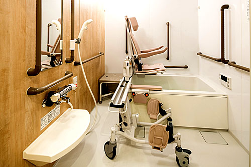 車椅子からの移乗もスムーズなリフト付きの個浴です。介助される方にとっても、安全で無理のない移乗が可能になります。