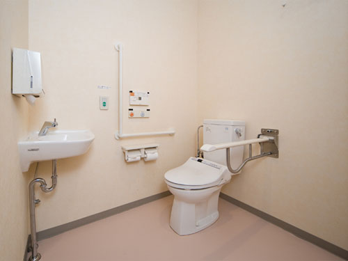 広くて明るい、清潔感のあるトイレ。車椅子にも対応しているので、安心してお使い頂けます。