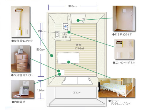 トイレ・洗面、壁面電気スタンド、ベッド脇用チェスト、内線電話、引戸式ドア、コントロールパネル、モーターリクライニングベッド