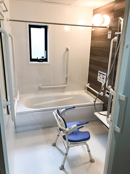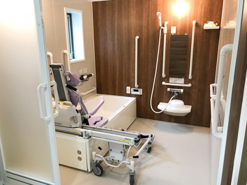 併設のデイサービスでは、入浴、排泄、食事などの介護や、油圧負荷マシンを使って機能訓練を行う日帰りの介護サービスを提供しています。