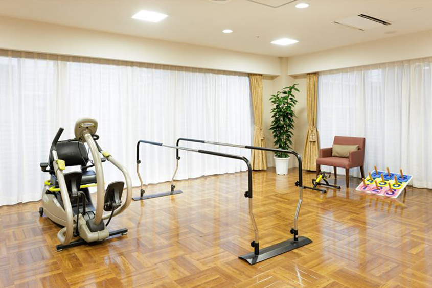 2Fのティールームにはマシンや平行棒などがあり、リハビリにご活用いただけます。