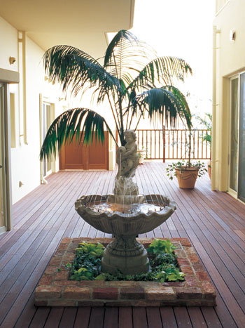 プールや椰子の木などがリゾート感を思わせる庭園。BBQやティータイムなど、さまざまなイベントも開催。