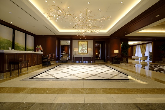 西宮市のシンボルである桜をモチーフとしたシャンデリアが印象的なエントランス。