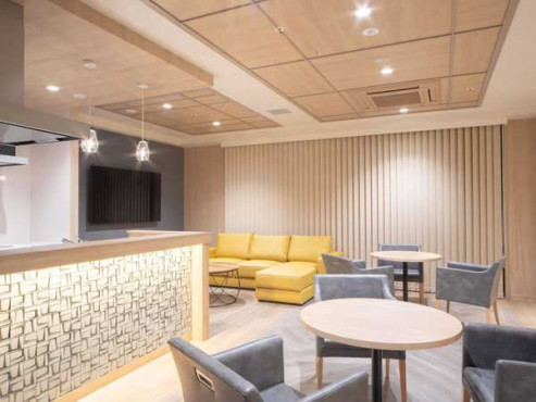 レストランには医療機関にも採用されている光触媒空気清浄装置を採用しており、居室の天井には心地よい空間をつくりだす珪藻土を使用しております。