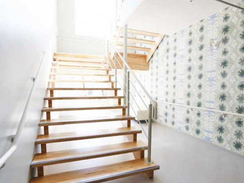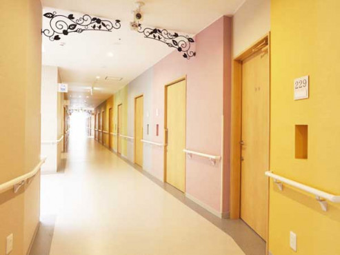 入居者様やご家族様の心が和むよう、またそれぞれのお部屋を認識しやすいよう、居室の並ぶ通路は桃色、水色、若草色、山吹色と、優しく変化ある配色が目を楽しませ、それに合わせて居室内の色も変えています。