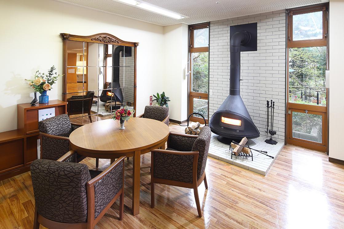 「山荘」の名に相応しい暖炉前のラウンジになります。ご入居者様とご家族様の憩いの空間としてご利用いただけます。