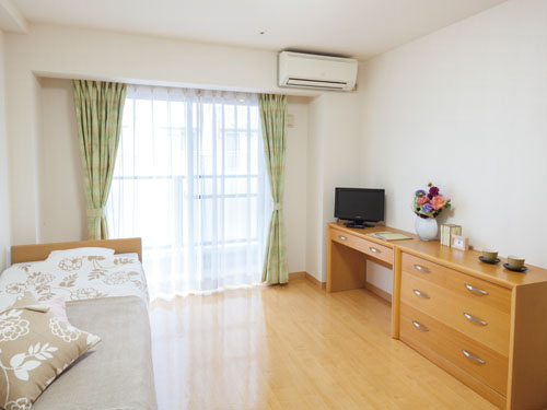 居室には介護用ベッド、寝具、エアコン、クローゼットが備え付けとなっております。