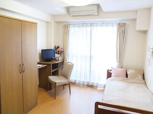 居室には介護用ベッド、寝具、エアコン、クローゼットが備え付けとなっております。