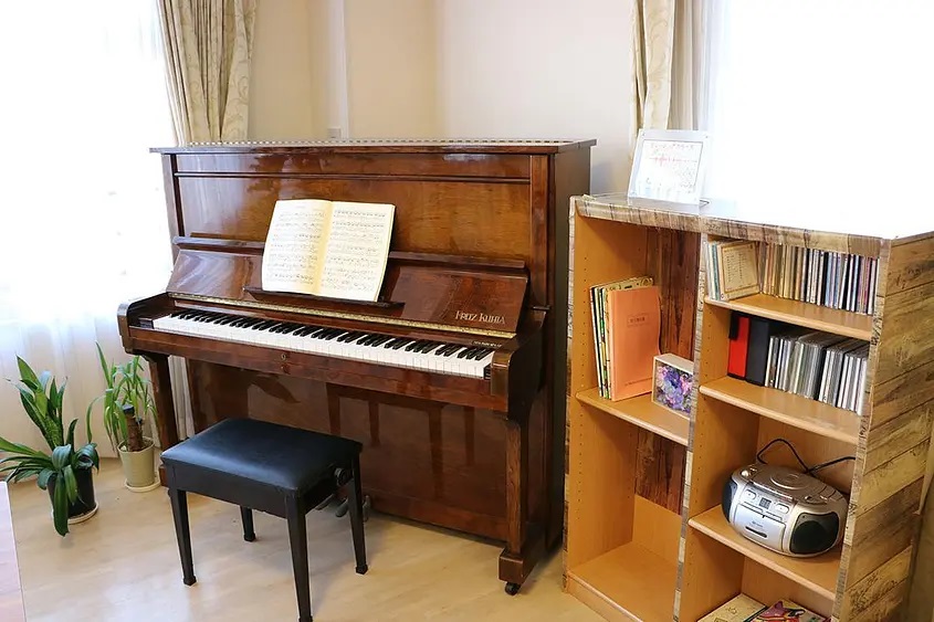 リビングルーム兼食堂兼機能訓練室内にあるピアノコーナー