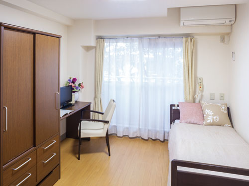 居室には介護用ベッド、寝具、エアコン、クローゼットが備え付けとなっております。