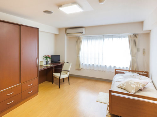 居室には介護用ベッド、寝具、エアコン、クローゼットが備え付けとなっております。