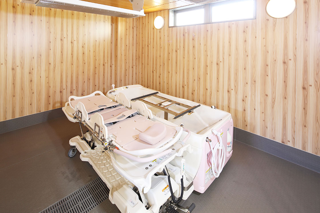 ウッドデッキ、ダイニングルーム兼機能訓練室、ファミリールーム、健康管理室兼事務室、洗濯コーナー、談話スペース、浴室