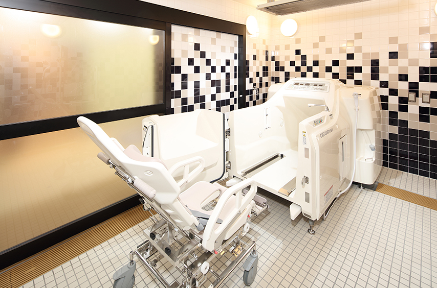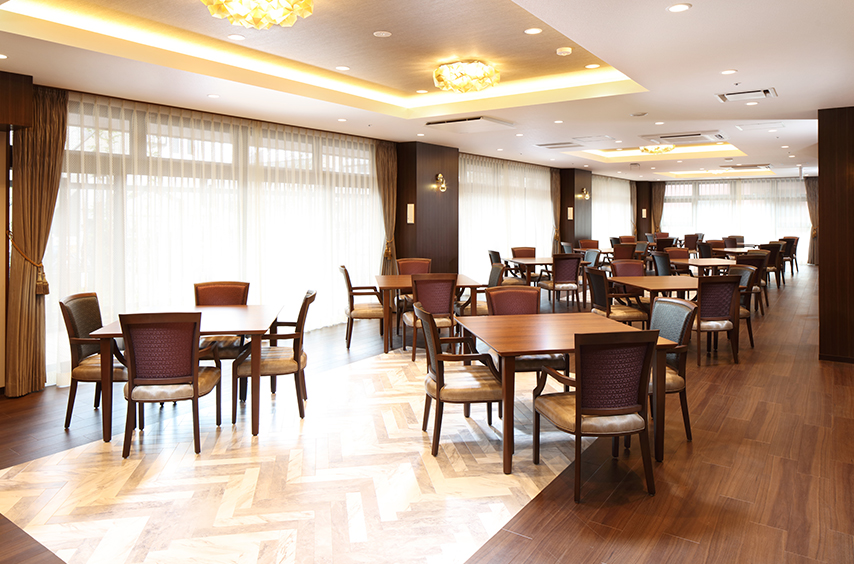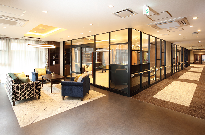 ウッドデッキ、ダイニングルーム、テラス、ビューティサロン(各種の外部サービス〔利用者実費負担〕を受けるための部屋)、ファミリールーム、機能訓練室、健康管理室兼事務室、洗濯コーナー、談話スペース、浴室