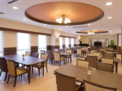 ダイニング(食堂) 兼 機能訓練コーナー、健康管理室、理美容室、浴室(個浴、特殊浴)、一時介護室、 ケアステーション、洗濯室、ファミリーダイニング、カフェ、ラウンジ、トイレ他