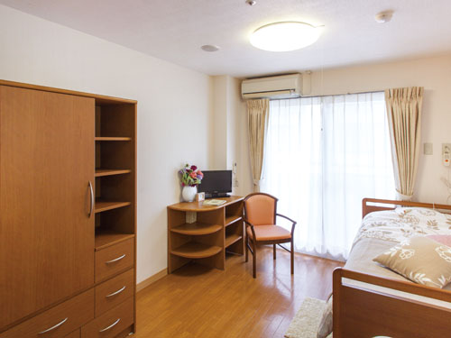 居室には介護用ベッド、寝具、エアコン、クローゼットが備え付けとなっております。