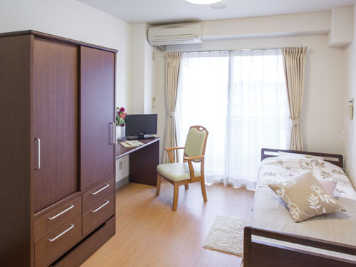 居室には介護用ベッド、寝具、エアコン、クローゼットが備え付けとなっております。