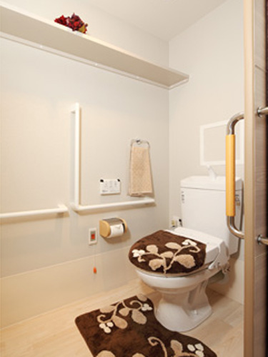 ウォシュレット・便座保温付きで使いやすい洋式トイレ。緊急時コールボタン・手すりも付いて安全です。続きを読む -