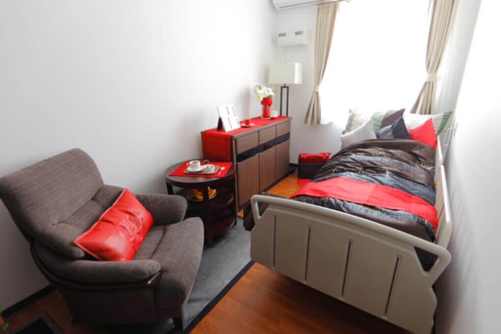 自然光が差し込む居室。全室介護ベッド、エアコン、照明、カーテンを完備。 また使い慣れた家具やテレビ、新しくそろえた調度品等の持ち込みも自由です。続きを読む -