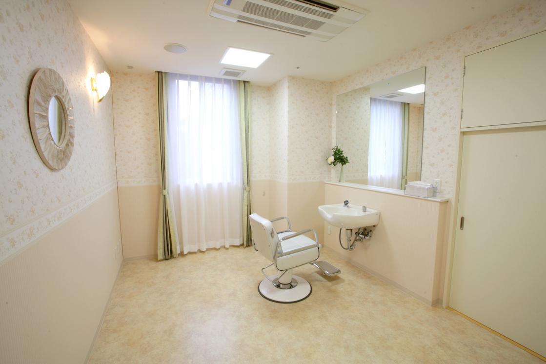 月に約2回の有料訪問理美容サービスがあり、カット・パーマ・毛染めと様々なメニューをそろえています。(各種の外部サービス〔利用者実費負担〕を受けるための部屋)
