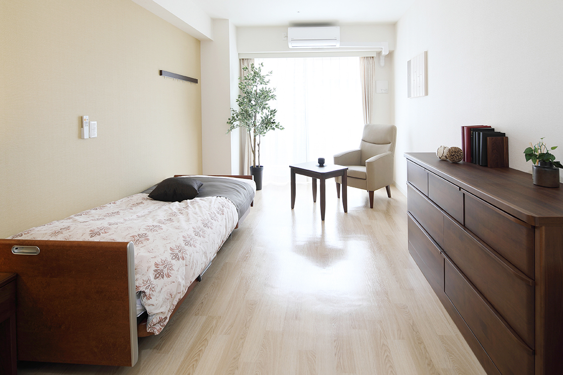 クローゼット、テレビ配線、ナースコール、温水洗浄機能付トイレ、介護用電動ベッド、洗面、電話配線、冷暖房設備 ※すべての居室にない設備もございます。