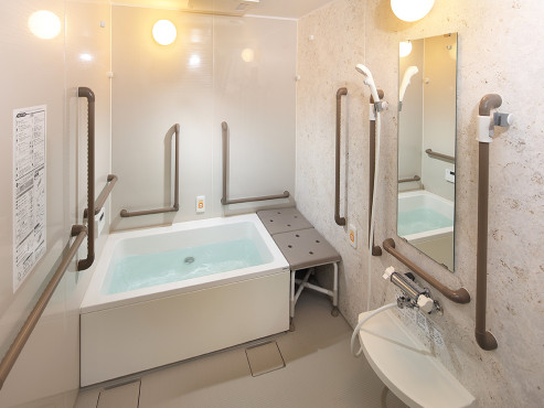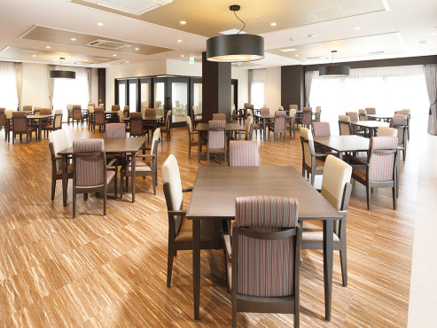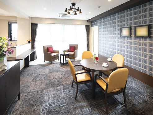 ダイニングルーム兼機能訓練室、ティールーム、ビューティサロン(各種の外部サービス〔利用者実費負担〕を受けるための部屋)、ファミリールーム、健康管理室兼事務室、洗濯コーナー、浴室