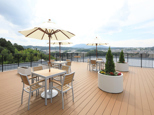 屋上デッキから見える絶景はホームの自慢のスペースです。お茶会や花火、ビアガーデンなど楽しいイベントも開催されています。四季の移ろいを肌で感じながら毎朝のお散歩や、外気浴をお楽しみいただければと思います。