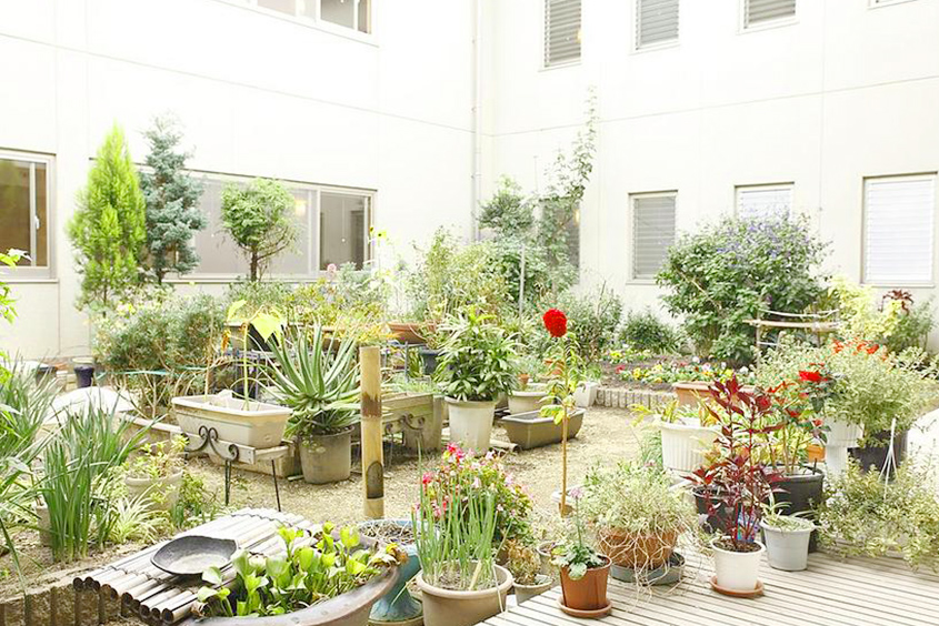 トイレ、リビングルーム兼食堂兼機能訓練室、健康管理室兼事務室、洗濯室、中庭、浴室