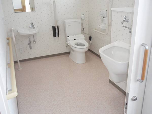 常時清潔が保たれているトイレは、ウォッシュレットも完備。もちろん自立を応援する手摺りも取り付けられています。