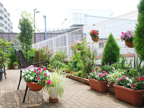 ご入居者様と一緒にガーデニングを楽しませていただいています。とても日当たりがよく、ご入居者様はのんびり日向ぼっこを楽しまれたり、シャボン玉を飛ばして遊んでいらしたりします。
