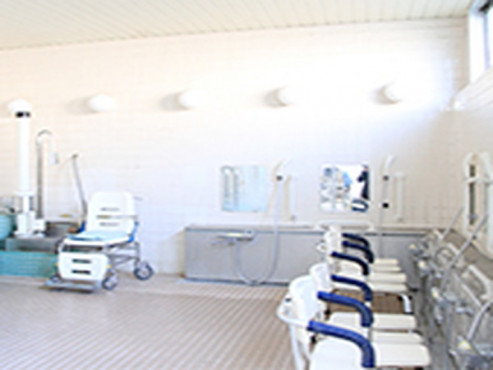 食堂兼機能訓練室、共用トイレ、車いす対応トイレ、洗面、大浴場、個浴室、機械浴室、洗濯室、談話室、ナースコール、冷暖房