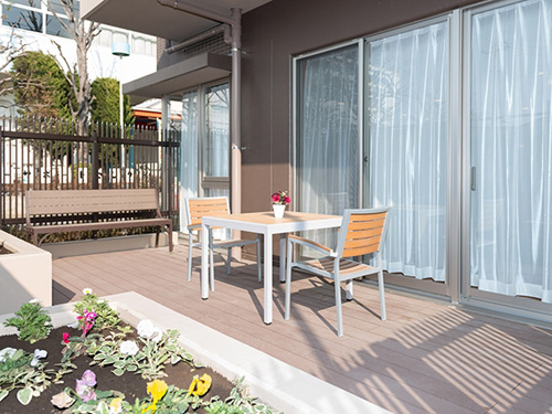 あたたかな陽光が差し込むウッドデッキテラスには、花や野菜を育てる農園もあります。晴れた日には、のんびりとティータイムをお過ごしください。