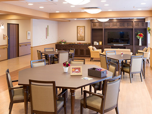ダイニング(食堂)、機能訓練コーナー、理美容室、浴室(個浴・特殊浴)、ケアステーション、洗濯室、カフェ、ラウンジ、トイレ他