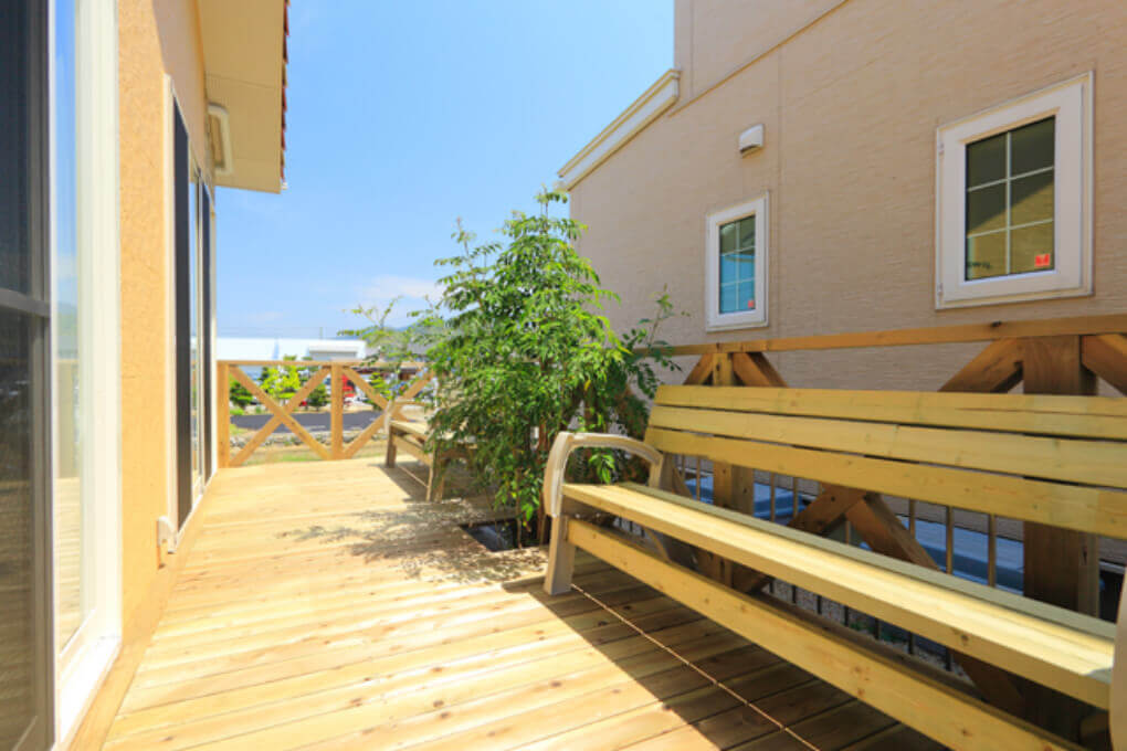 1Fに暖かな陽が差し込むウッドデッキを設置しており、ご利用者様同士の憩いの場となっています、