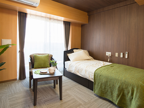 落ち着いた雰囲気の居室。個人の居室には、使い慣れた家具をお持込みいただくことも可能です。まるでご自宅にいるような雰囲気をあじわえます。