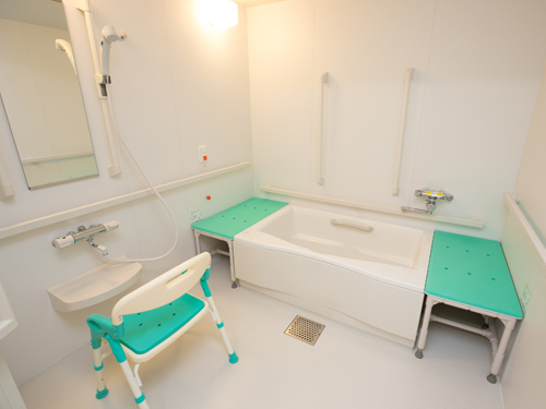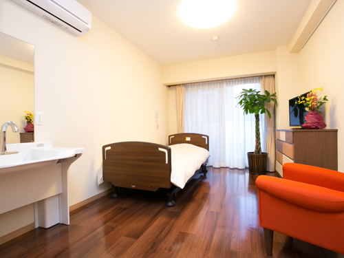 介護用電動ベッド、温水洗浄機能付トイレ、洗面台、エアコン、カーテン、緊急コール、スプリンクラー